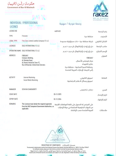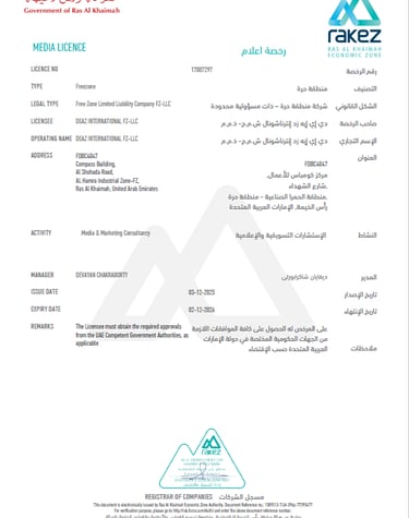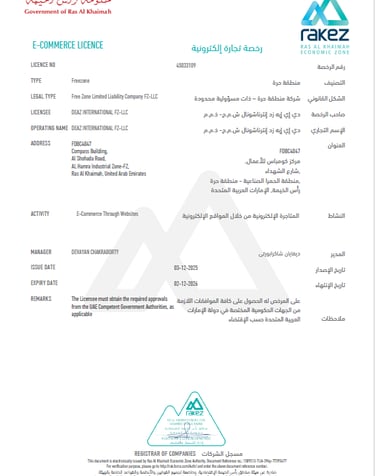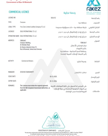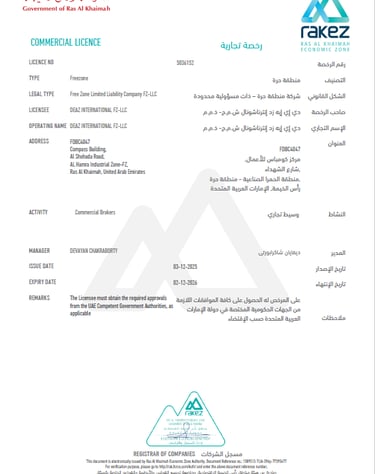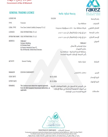 DEAZ International FZ LLC is a UAE licensed trading, sourcing and marketing consultancy company operating from Ras Al Khaimah Economic Zone (RAKEZ). We support cross-border transactions, supplier verification, marketing consultancy and structured trade execution for international clients.